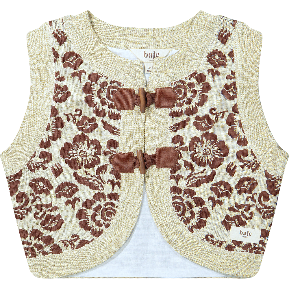 capri - JacquardPretty gilet: Baje’s Capri gilet is one of the most outspoken styles this season. The premium knitted jaquard quality combined with the unique allover flower pattern is a real one of a kind. The duffle coat closure gives the gilet an perfect wearing comfort.