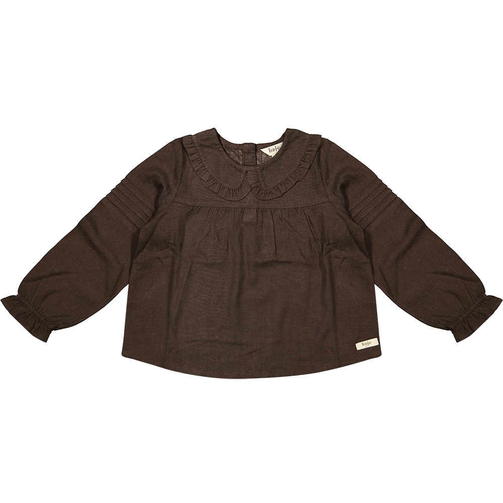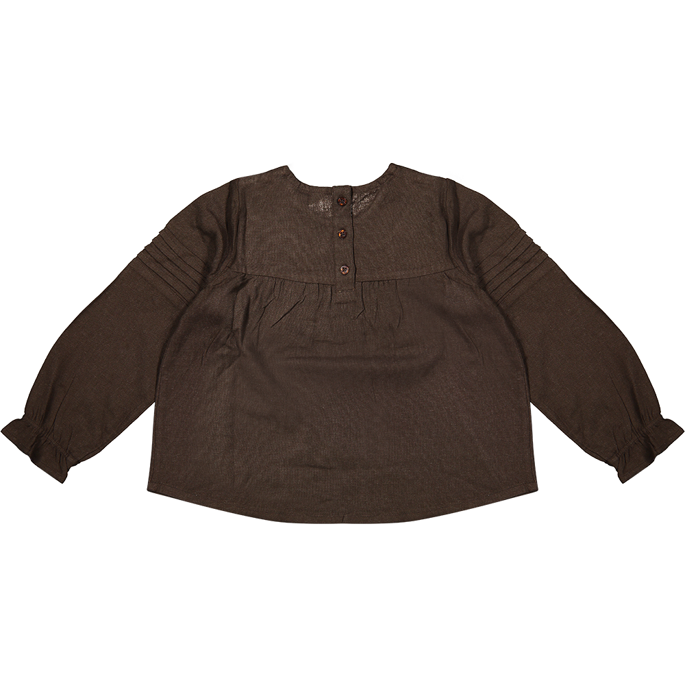 foggia - Linnen brownMade from our soft linen premium quality, we present the woven blouse Foggia. The blouse has a comfy fit, with a ruffled collar and sleeve ends. The pintuck details at the sleeves, together with the sophisticated ruffled collar, gives this blouse a special touch. Perfect to combine with the flared rib leggings and the linen pants Arona.
