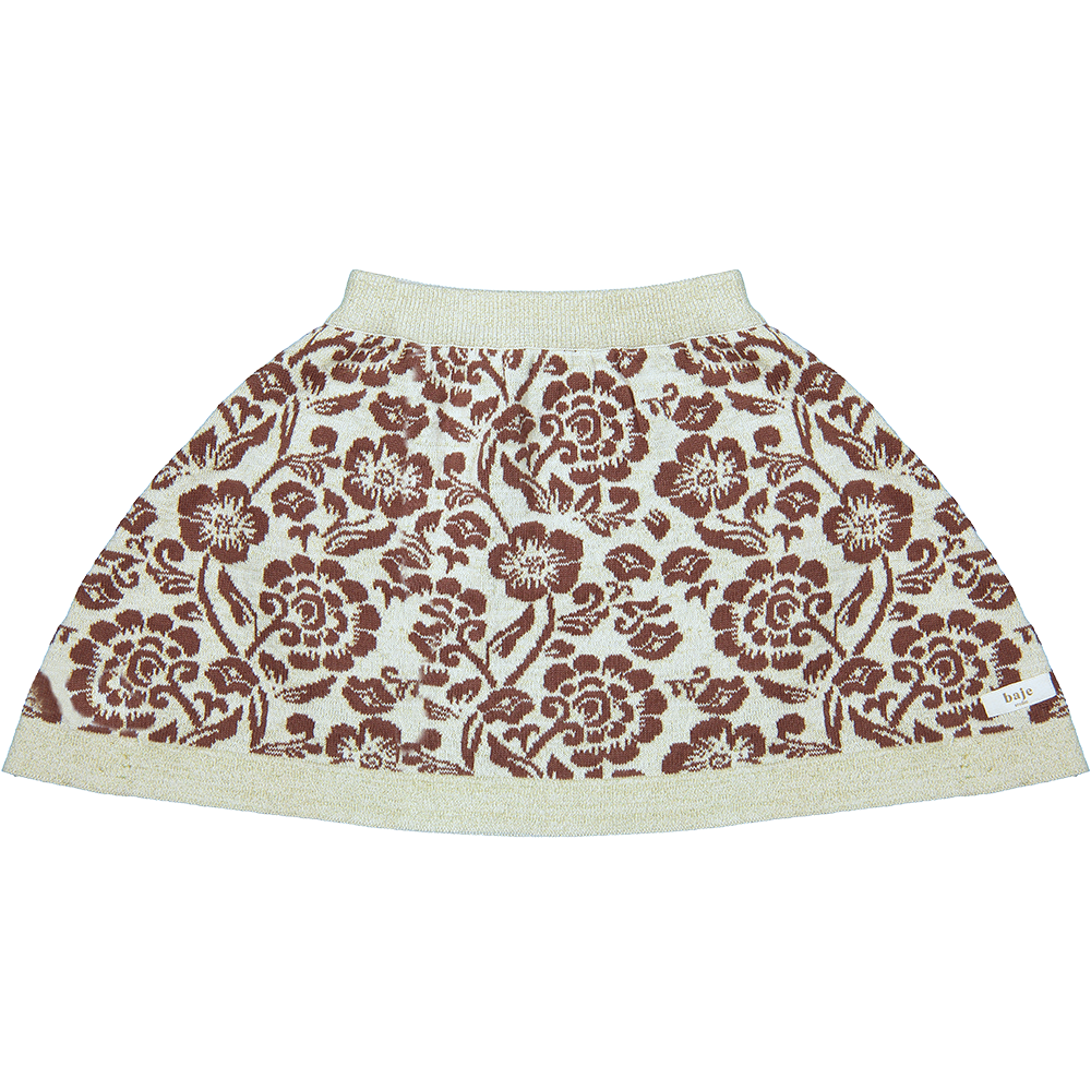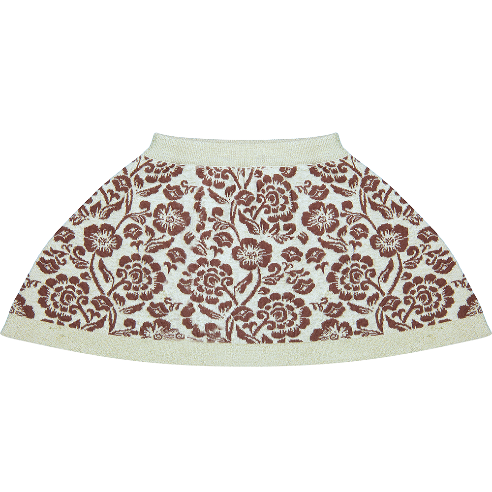 The premium knitted jaquard quality combined with the unique allover flower jacquard is a real one of a kind. The skirt has a balloon shape and twisted gold glitter yarn knitted in the waistband and bottom. Perfect to combine with Crema rib longsleeve or Verona sweater for a total flower look.